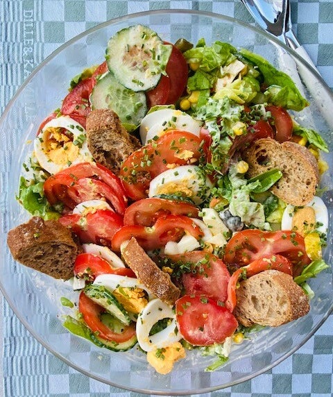 Snijd de tomaten en het laatste ei in plakjes en garneer samen met de stokbroodjes de salade ermee.