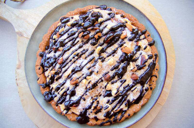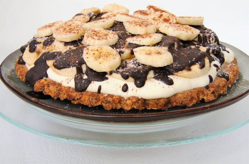 De bodem bestaat voor een groot deel uit fijn gehakte walnoten en de laag romige kwark, banaan en karamel zorgt voor een fijne verdeling van structuren en smaken.